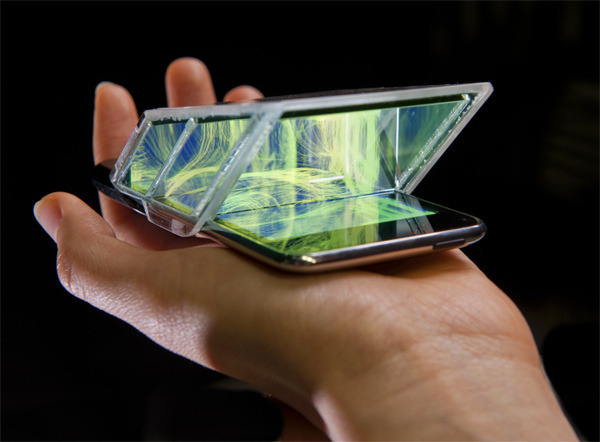 Наладонный 3D-театр i3DG использует экран вашего iPhone для превращения 2D-картинки в псевдо-3D, видимое невооруженным глазом (не требуется ни очков ни прочих дополнительных приспособлений) – в данном случае используется старая как мир техника «призрак Пеппера». На экран смартфона надевается конструкция из трех стекляшек, две из которых полупрозрачные, а третья имеет зеркальную поверхность. Три стекляшки отражают разные участки дисплея телефона, создавая как бы три слоя разделенные небольшим пространством. В видеоролике вы можете посмотреть работу такого решения на примере.